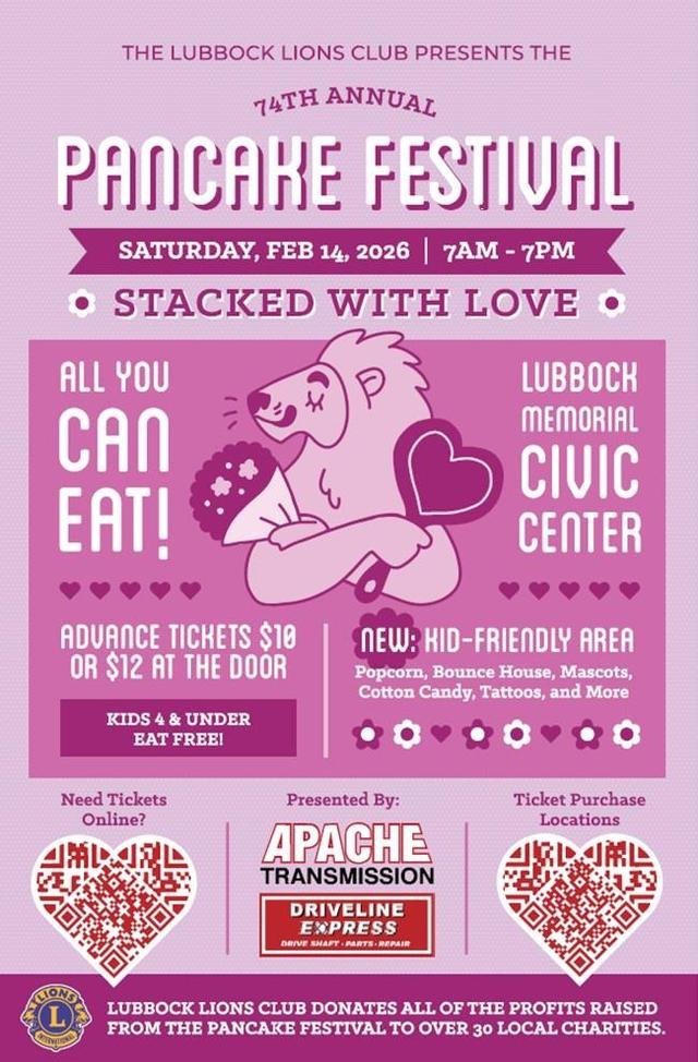 Back to All Events Lubbock Lions Club 74th Annual Pancake Festival Saturday, February 14, 2026 7:00 AM 7:00 PM Lubbock Memorial Civic Center 1501 Mac Davis Lane Lubbock, TX, 79401 United States (map) Google Calendar ICS Every Saturday in Wolfforth year-round. Family and pet friendly farmers market with over 100 local vendors and over 3 acres for a day full of shopping, eating, and fun for the whole family. Learn more